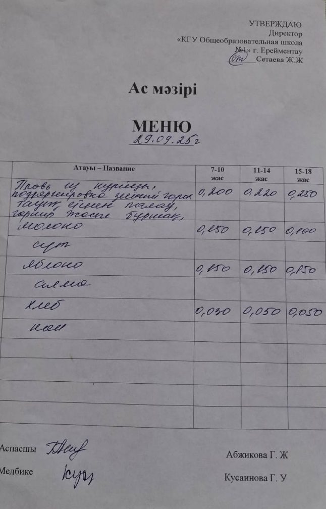 Ас мәзірі 29.09.2025